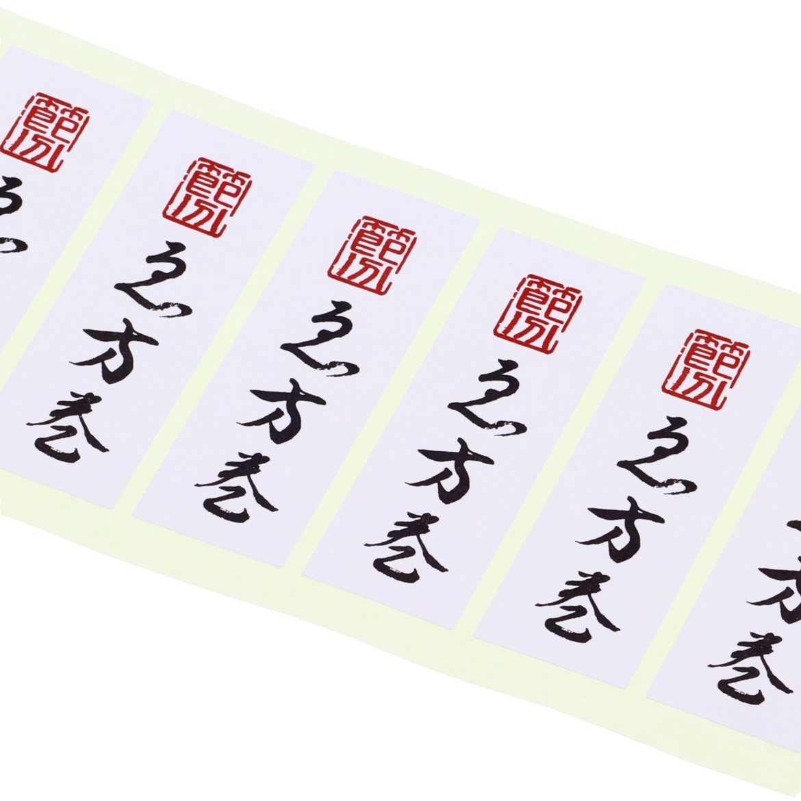 折峰オリジナルの書を使用。どんな素材の折箱や掛紙にも合わせやすいシンプルな紙質のシールです。