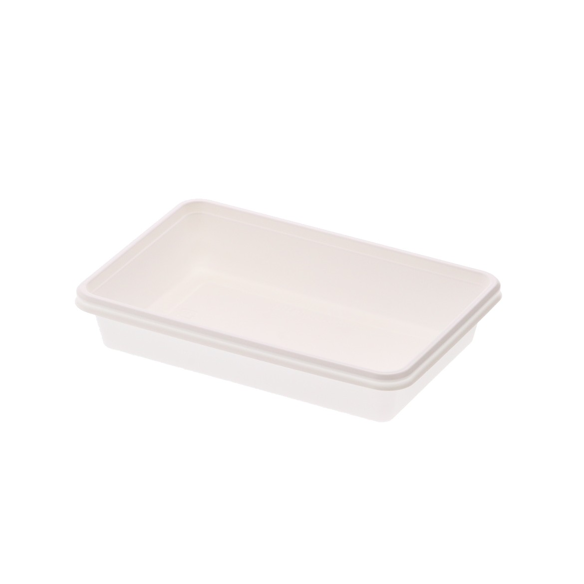 高さ約3cmの浅型・長方形形状で、少量盛りや大きめ具材の惣菜にも向いています。
