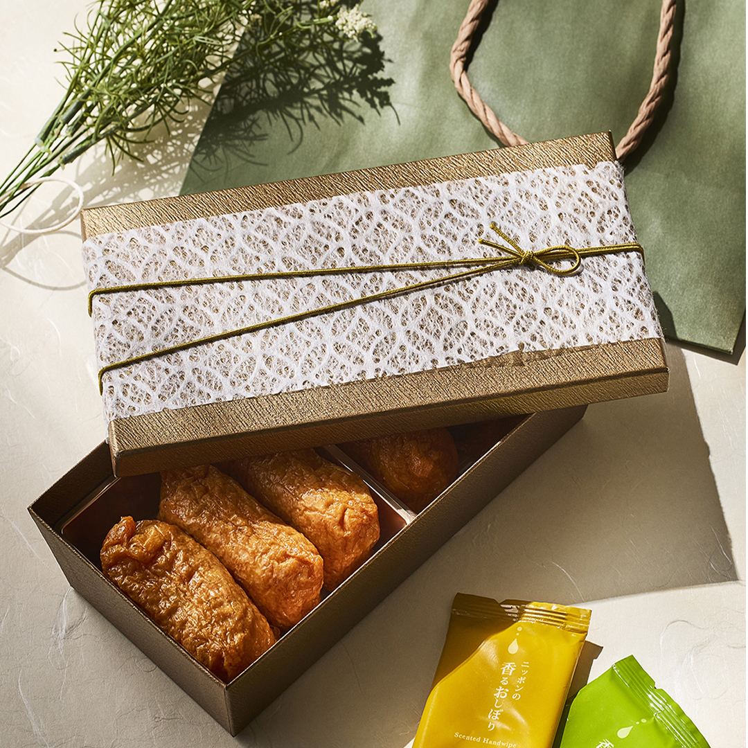 春に向けた、いなりなどの小ぶりなお弁当に最適な「折箱・掛紙・ゴム」の3点セットの商品です。