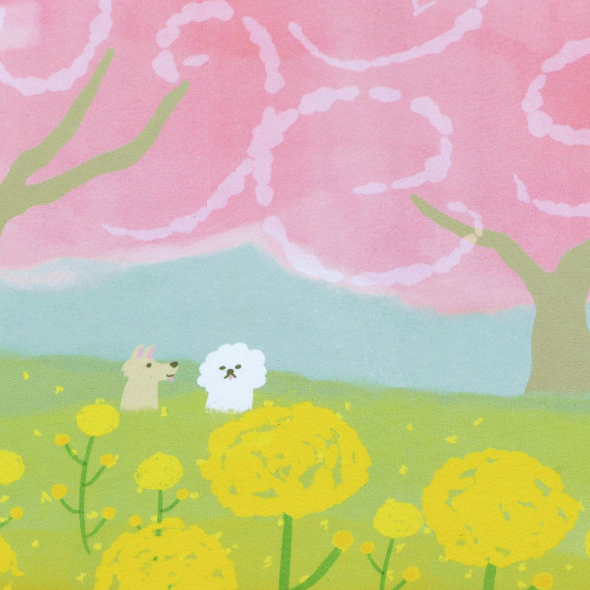 満開の桜の下、菜の花が広がる丘。その中に、3匹の犬たちがかくれんぼをしている穏やかであたたかな情景を一面に描きました。
