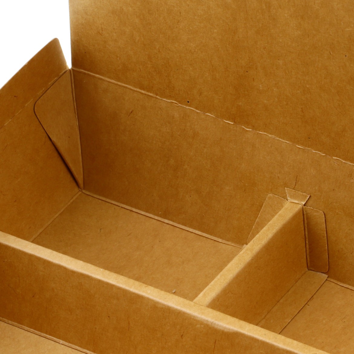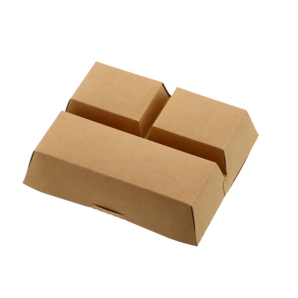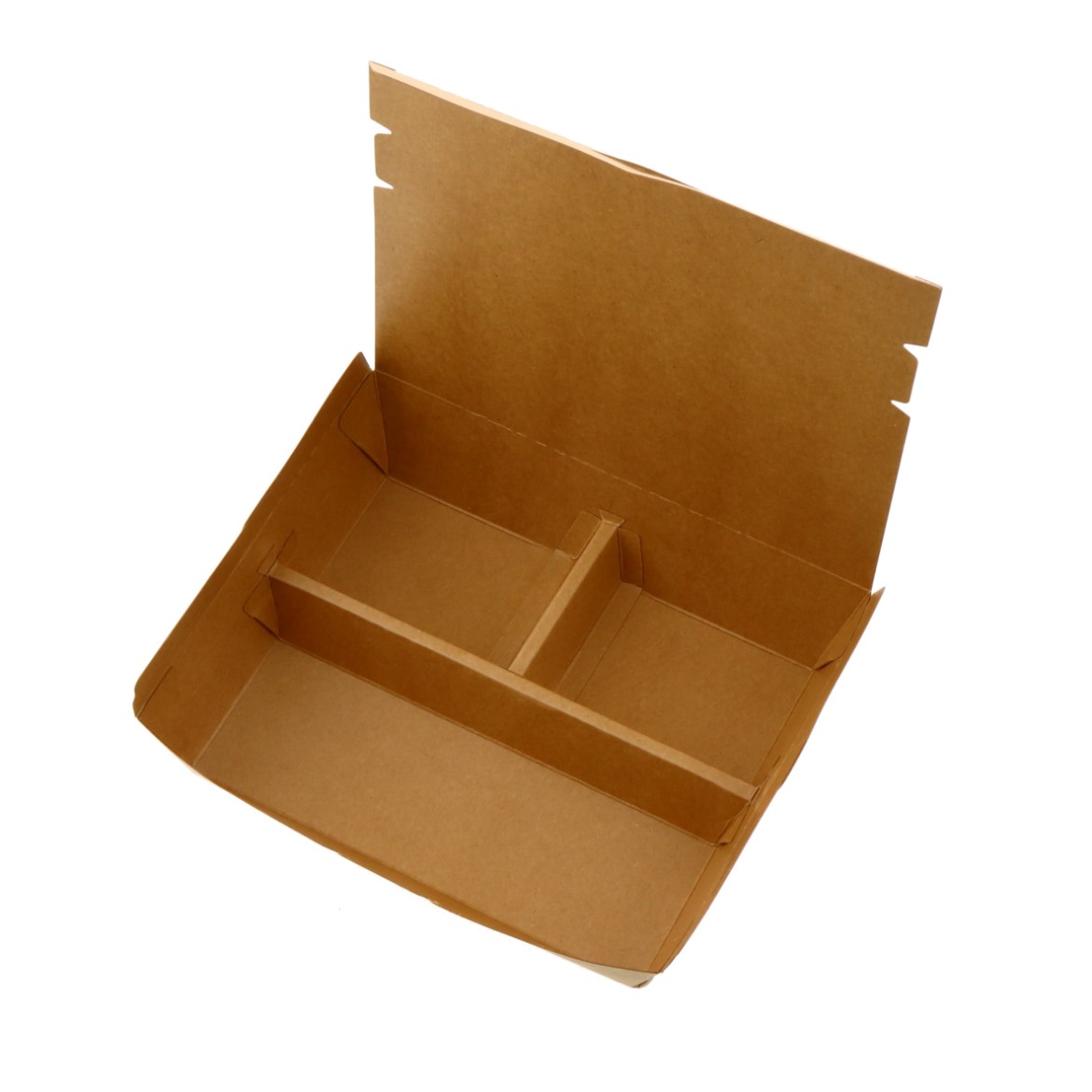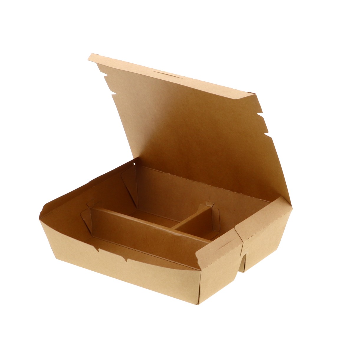 本体とフタが一体になったボックスタイプで、3仕切付きのため、主食と副菜、副菜同士を分けて盛り込みやすい仕様です。蓋にはつまみが2か所付いており、差し込んでロックできるため、持ち運びの際にも蓋が開きにくくなっています。お弁当用途はもちろん、ビュッフェ形式のお持ち帰りにもおすすめです。