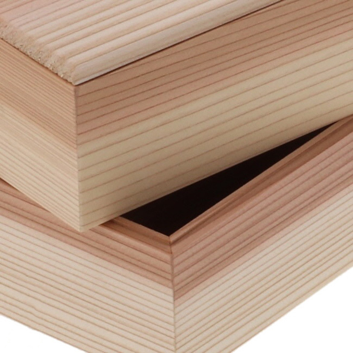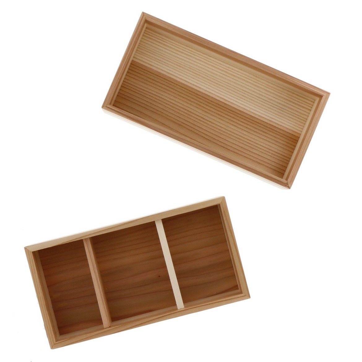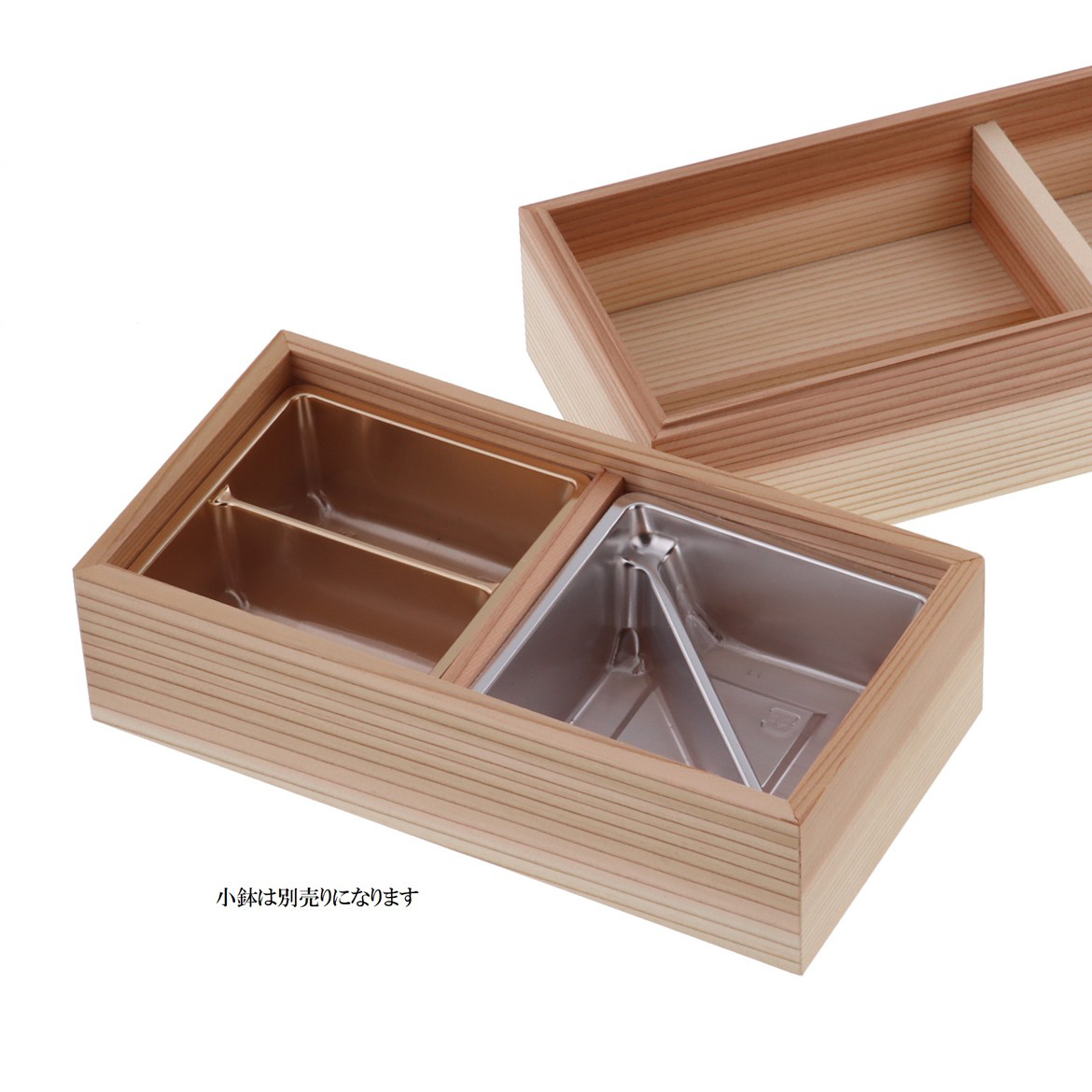 蓋のエッジが丸く削られているのが特徴的な杉の折箱です。盛り込みの際に便利な可動式の仕切が二枚入っています。