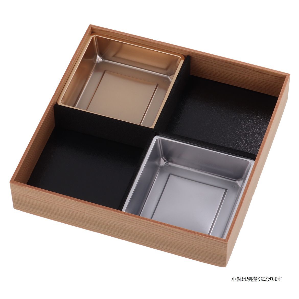 四分する十字の仕切りが付いた、少し大きめの松花堂弁当に最適です。シンプルなデザインはどんな料理にも合わせやすいため、洋風のお弁当にもおすすめです。小鉢80がぴったりと入りますので、汁物や汁もれしやすいおかずを入れる際には併せてご利用ください。