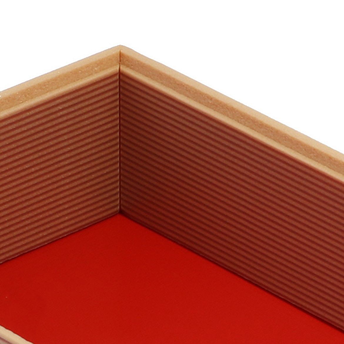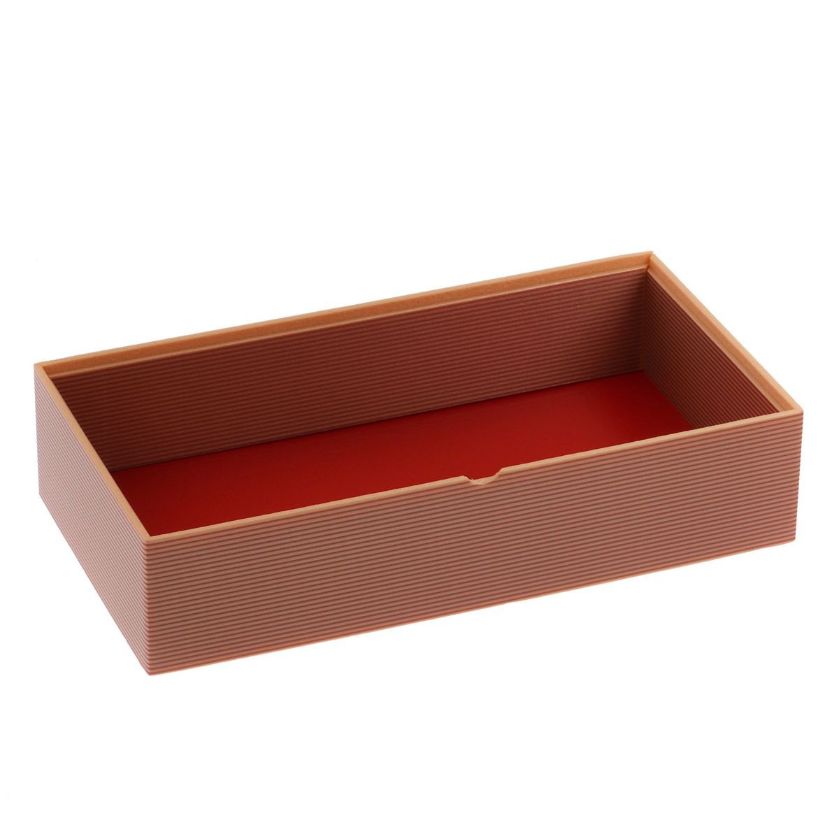 落ち着いた色合いで、エンボス加工も施された木目のような風合いは高級感もあり、お弁当には最適です。赤い底板は見た目からも、料理の美味しさを演出してくれます。側板は比較的硬めの素材ですので、積み重ねて配送いただく際にも安心です。