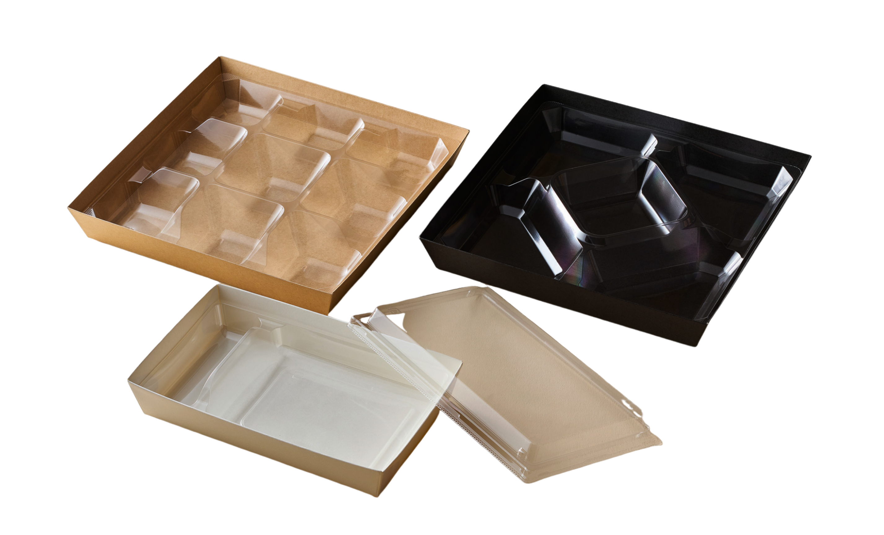 単価16.0円~※本体・蓋別売。本体にフチのないスタイリッシュでシンプルな電子レンジ対応の紙容器です。2つに区切られた中仕切のご用意もございます。 -