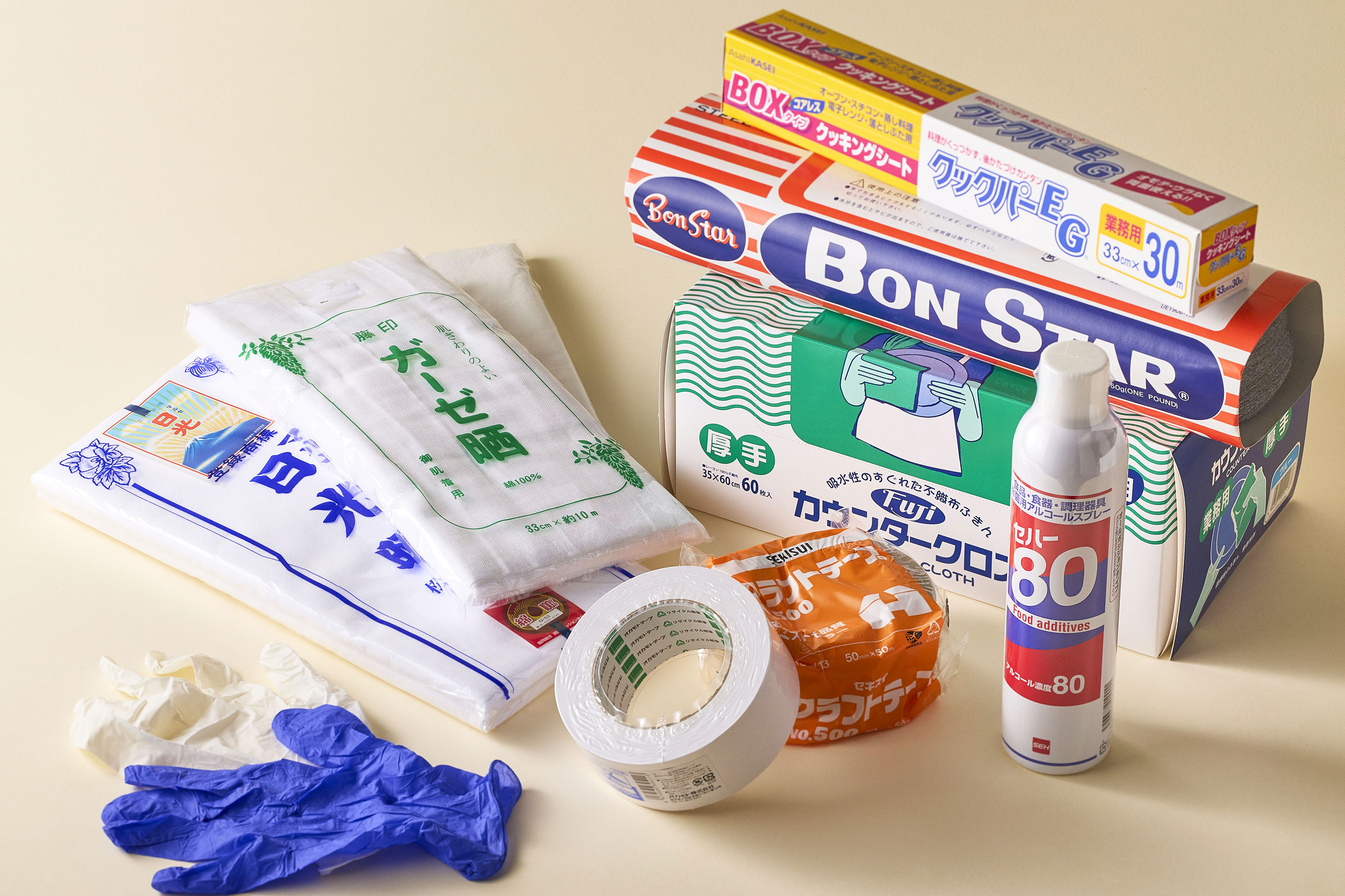 晒やクッキングシート、クロス、アルコールなど、日々の仕込みや盛付けに欠かせない備品を取り揃えています。