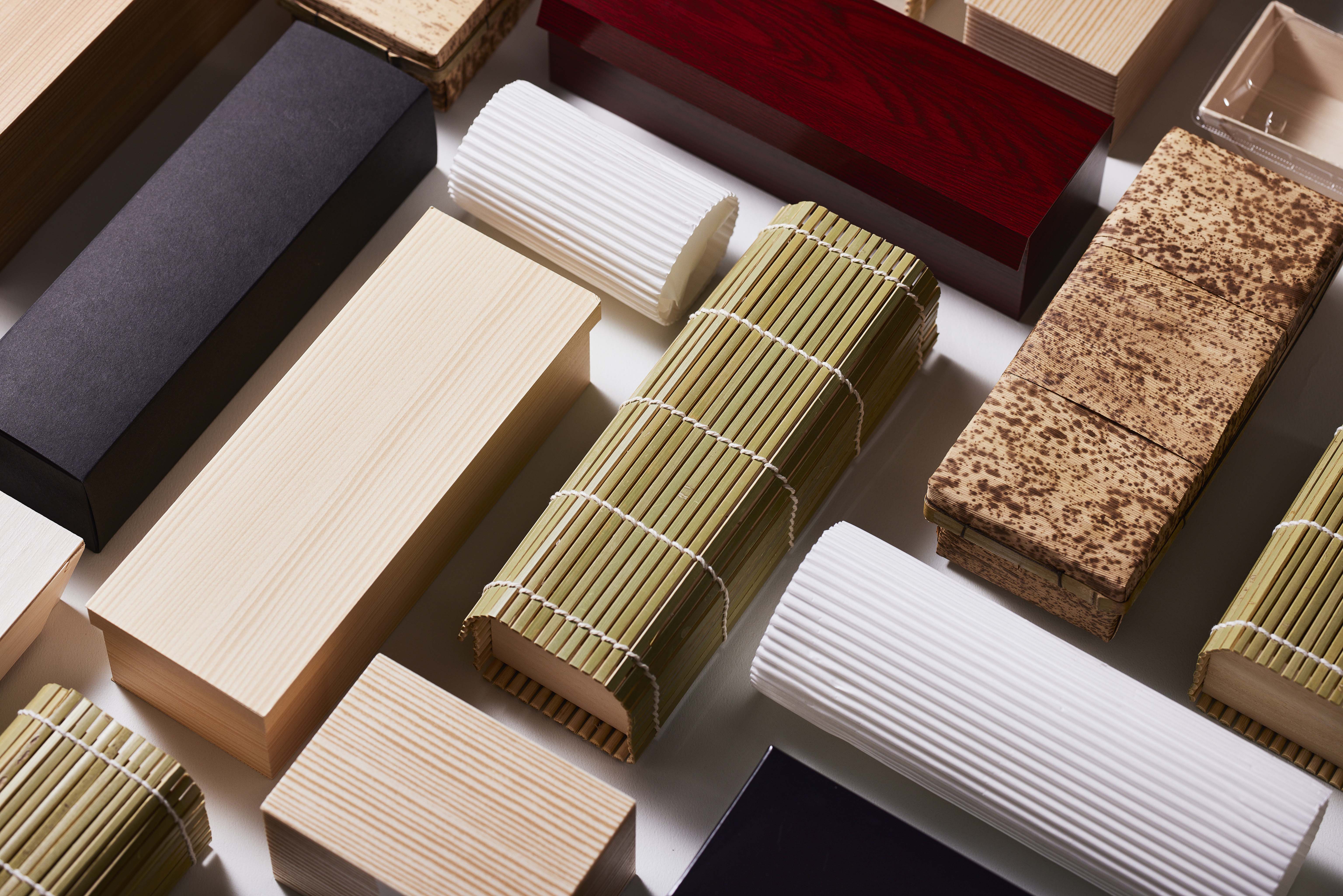 高級感のある仕上がりでご好評いただいている「sugi hako」をはじめ、プラスチック製・紙製の定番折箱、竹皮やすだれを用いた和の趣を感じる折箱まで、用途や販売形態に応じて選びやすいラインナップをご用意しています。