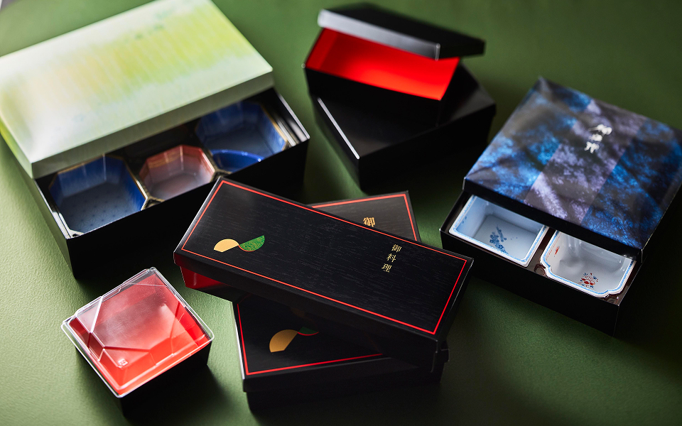 専用の仕切を使用する商品やそのまま盛り込める紙ボックスタイプの折箱を取り揃えています。