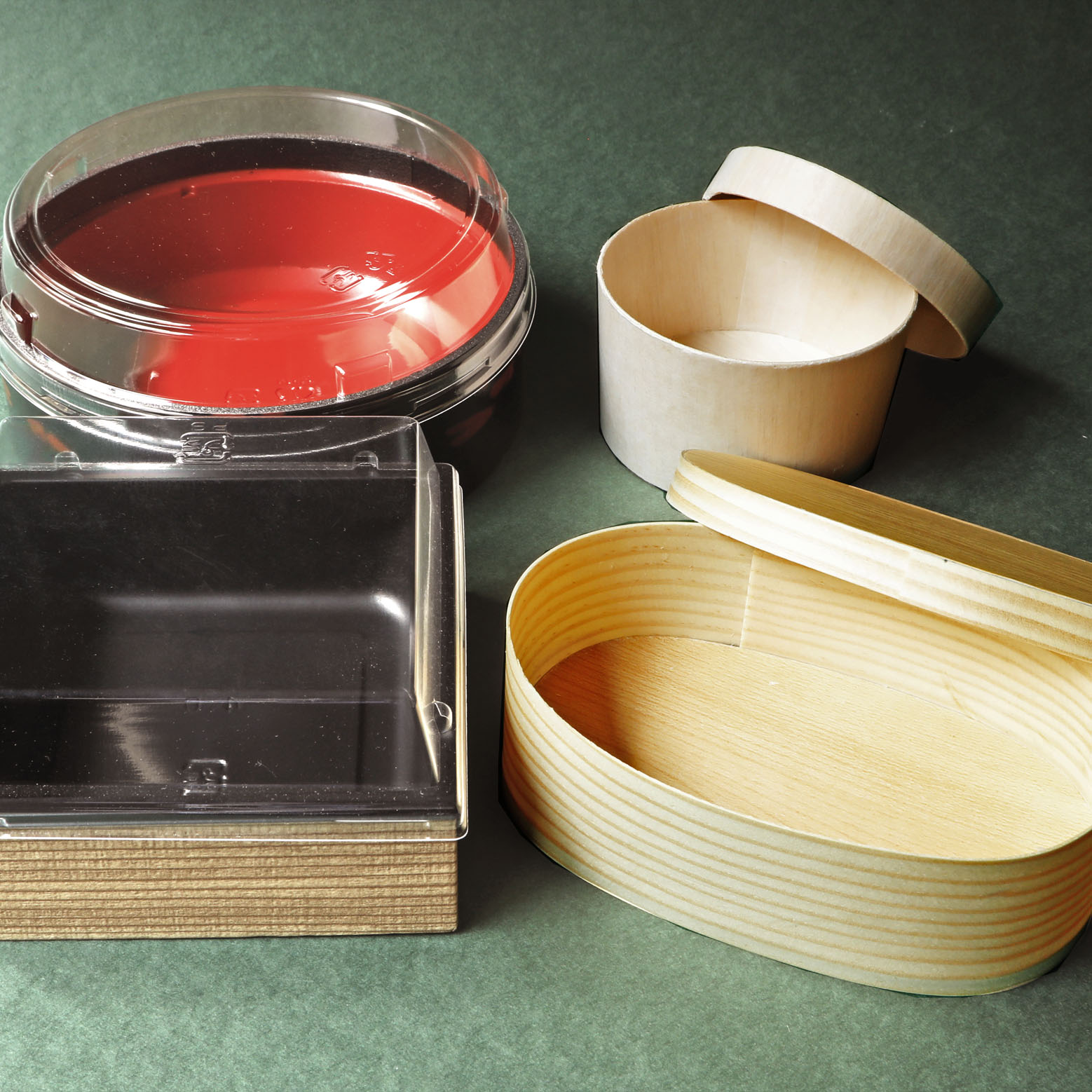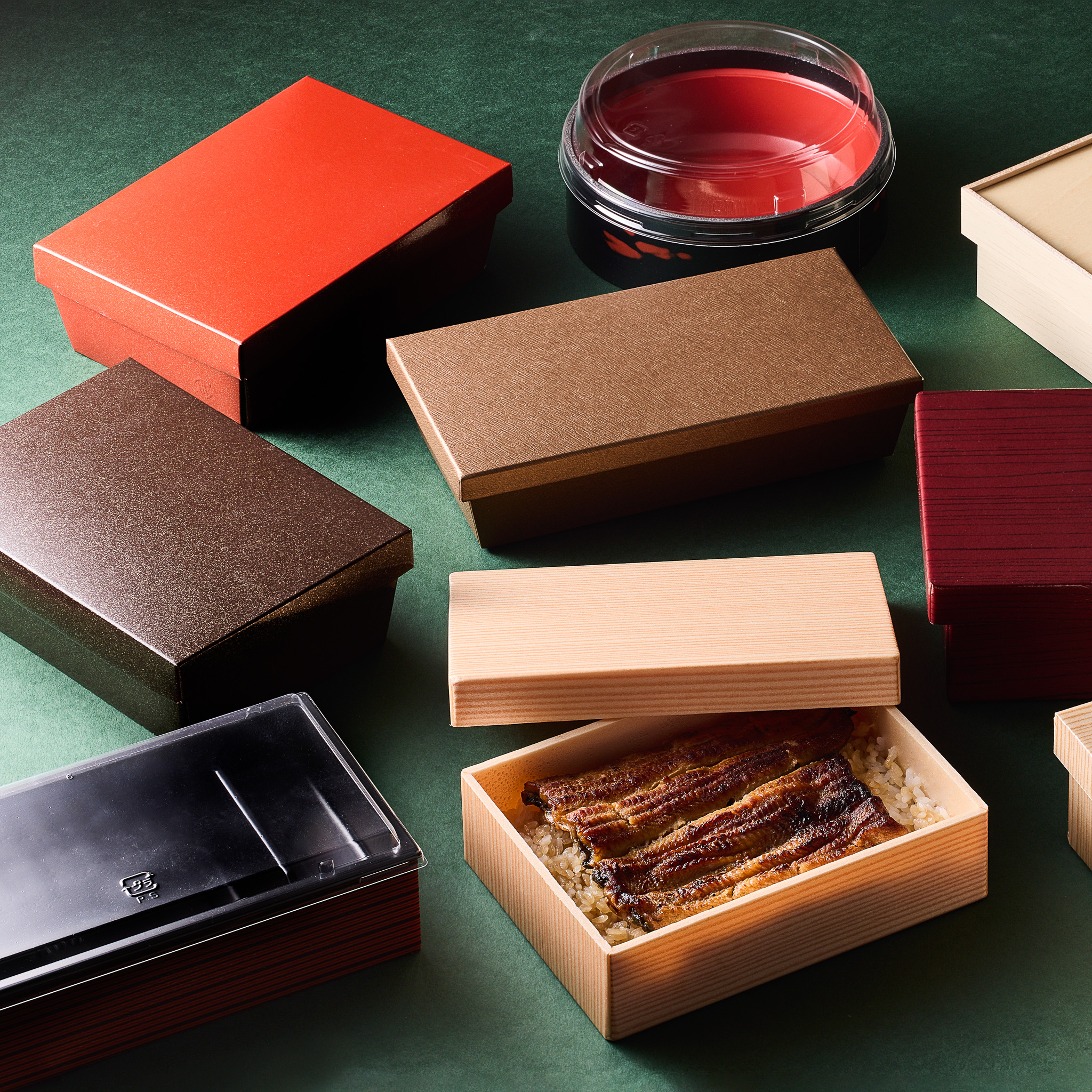 折箱・掛紙・付属品はもちろん、漆器の丼重まで取り揃え、テイクアウトから店内提供まで幅広く対応。