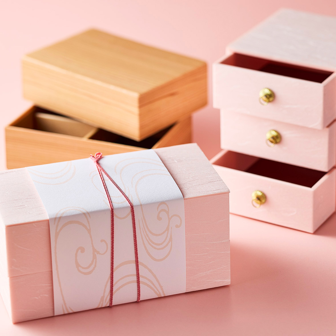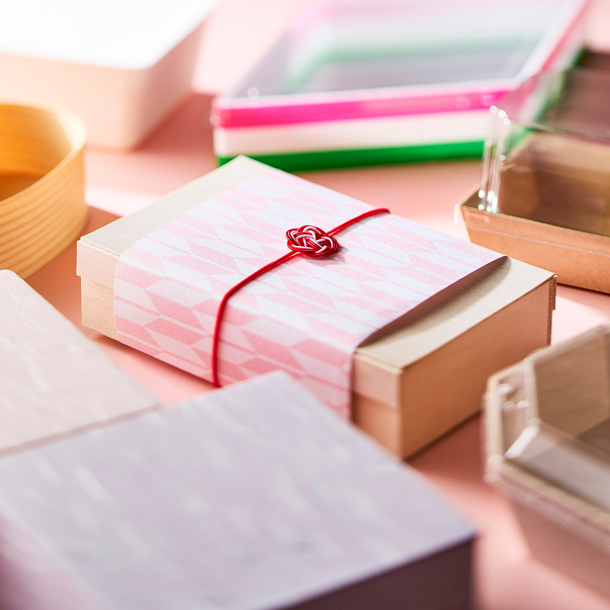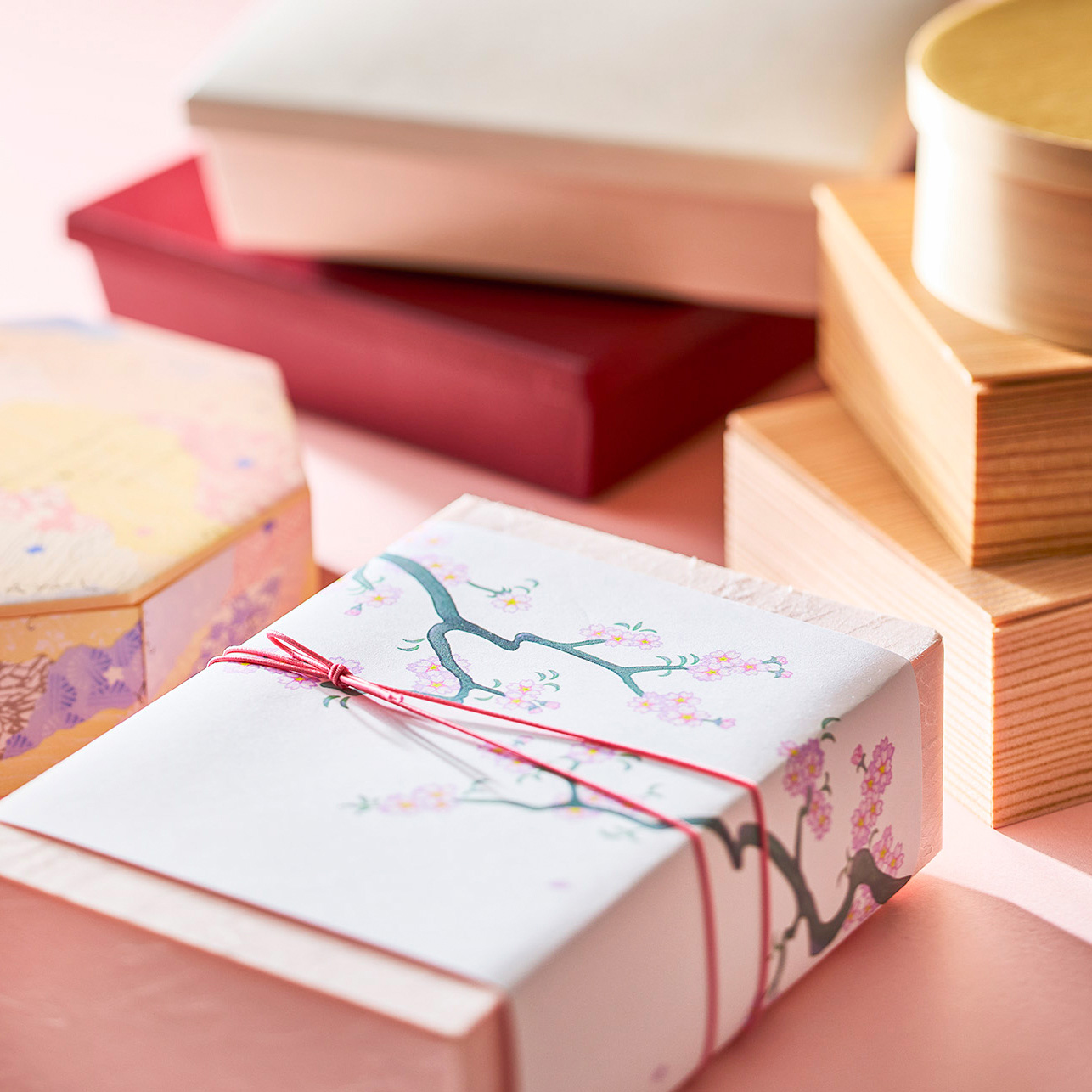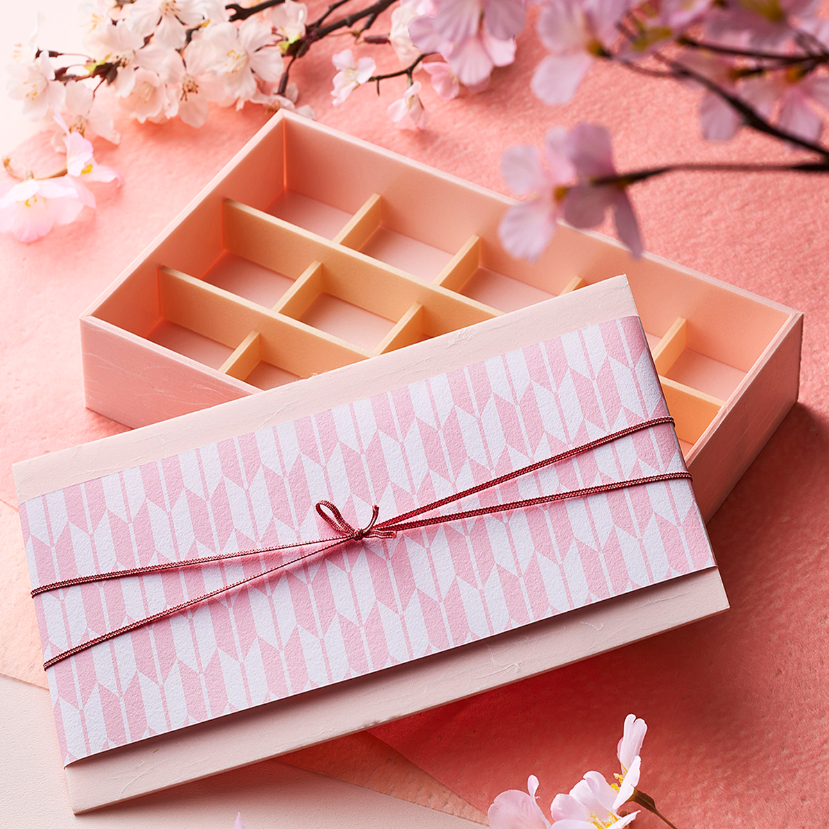 掛紙やゴムをさし色にしたり、春色の折箱や風呂敷で季節感を演出していただけます。